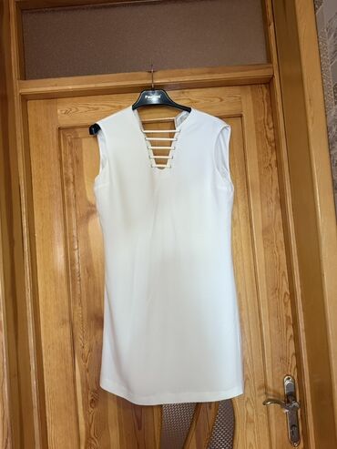 Ağ rəngli, qolsuz mini don. Ön hissədə V-kəsim dekolte və metal