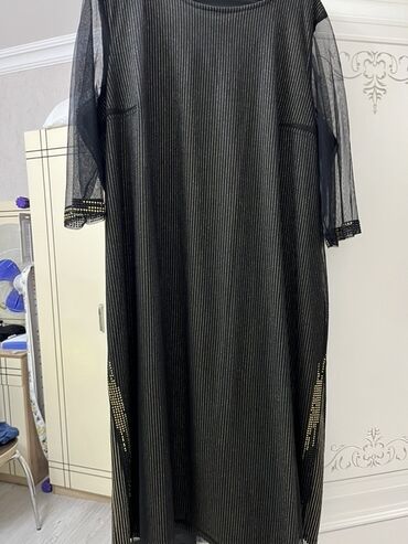Razmer 38-40 1 dəfə geynilib 300 manata alinib Qara rəngli, uzun axşam geyimi. Tam boy payetlərlə bəzədilib, zolaqlı parıltı effekti verir. V-yaxa, uzun qol, ön hissədə drapirovka və yığma düyün de...