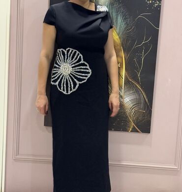 Qara axşam/ziyafət geyimi - Rəng: qara - Uzunluq: uzun, yerə qədər - Parça: axıcı, yüngül və parıltısız toxuma (üst hissə məxmərə bənzər görünüşlü) - Dizayn: ön hissədə mərkəzi büzgü detalı, zərif...