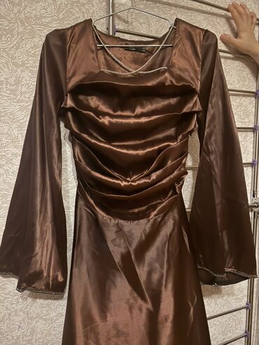 Qəhvəyi atlas parıltılı uzun don - Rəng: tünd qəhvəyi - Material: zərif, yumşaq, atlas effektli parça; axıcı faktura - Model: uzun qollu, yüngül puff-effektli qollar - Yaxa: qapalı, dairəvi - Bel ...