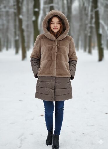 Qadın qış gödəkçəsi 42-44 - Rəng: açıq qəhvəyi/karamel tonları - Material: parıldayan suya davamlı toxuma, içi isti doldurmalı (quilted) - Kapüşon: iri, tünd qəhvəyi süni kürk haşiyəli - Bağlanma: ...