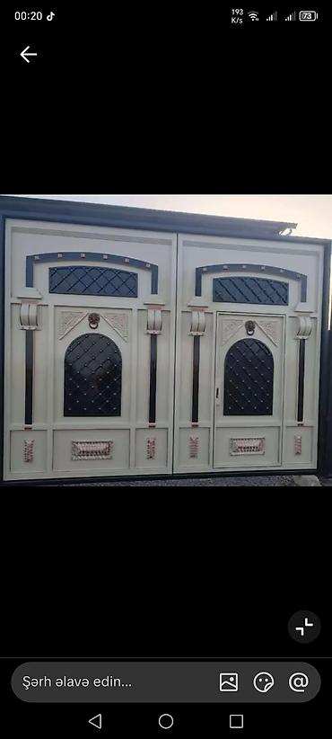 Şəkillərdə nümunələr: əvvəl/sonra bərpa işləri, dekorativ dəmir barmaqlıqlar, ikitaylı darvaza və fərqli dizaynlarda giriş qapıları.