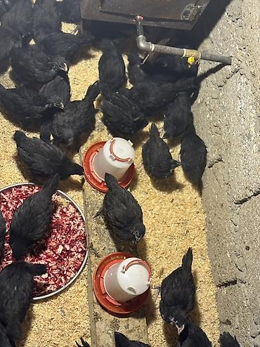 - Grup şəklində saxlanılır, hazırda qatıq/qarışıq yem və təmiz su ilə bəslənir (şəkildə yem və su qabları görünür).