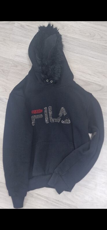Qara rəngli idman dəsti (2 parçalı): - Kapüşonlu svitşot və şalvardan ibarətdir. - Hər iki hissədə daşlarla işlənmiş “FILA” loqosu. - Svitşot: ön tərəfdə kenguru cib, kapüşonun içi tüklü/isti astar...