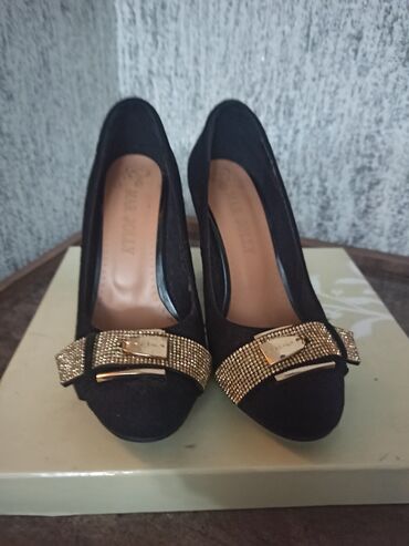 Qadın klassik tufliləri - Rəng: qara - Burun: iti (pointed toe) - Üst hissə: hamar teksturalı material - İçlik: açıq bej rəngli yumşaq iç altlıq - Dizayn: ön hissədə qızılı çərçivəli iri dekorativ...