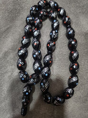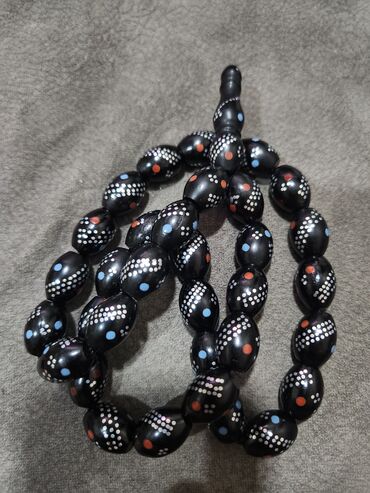 Məhsul: Naxışlı təsbeh - Material: Qara rəngli, parlaq səthli boncuklardan hazırlanmışdır. - Dizayn: Hər boncuk üzərində mavi və qırmızı nöqtələr, ətrafında xırda ağ naxışlar. Eyni üslubda, iri öl...