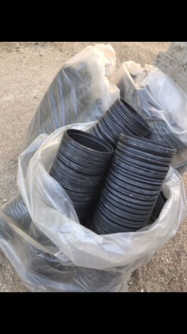 - Şəkillərdə çoxlu sayda yığılmış, nazik divarlı, silindrik formalı plastik bitki qabları.