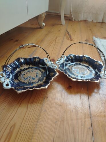 - 2 ədəd metal qulplu, dalğalı kənarlı porselen boşqab. Tünd lacivərd fon üzərində qızılı ornamentlər, kənarlarda qızılı haşiyə, qulplarda porselen bəzək detalları.