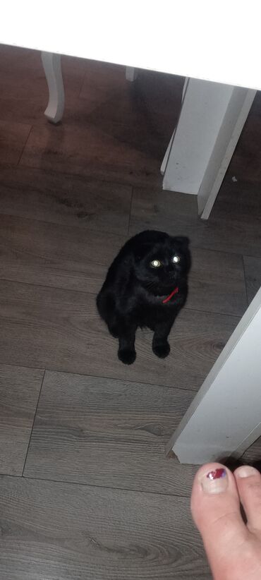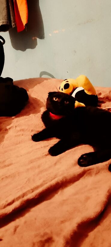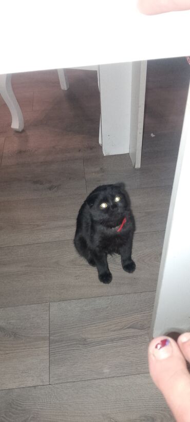 Qara rəngli Scottish Fold tipli pişik - Tam qara, qısa və parlaq tüklü - Dəyirmi baş quruluşu, qatlanmış qulaqlar - Sarımtıl-balıqqulu gözlər - Uzun quyruq, incə bədən quruluşu - Boynunda kiçik ya...