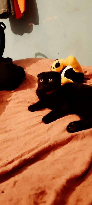 Scottish Fold pişik – qara rəng - Cins: Scottish Fold (qulaqcıqları qatlanmış) - Rəng: bərk qara, parlaq tüklü qat - Gözlər: iri, qızılı-sarı - Xarakter: sakit, mehriban, qucağı sevən; ev şəraitin...