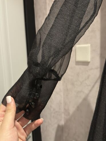 - Qol: şəffaf şifon, 3/4–tam uzunluq arası, manjetdə dekorativ qara düymələr