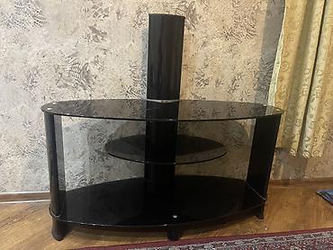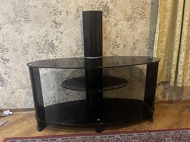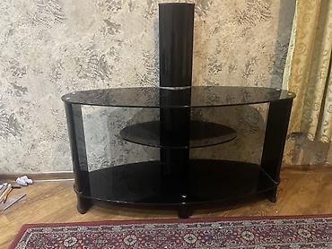 Qara şüşə TV stendi və divar/dirək montajlı TV tutacağı - Material: qalın temperli qara şüşə səthlər, metal dayaqlar - Konstruksiya: mərkəzi şaquli dirək və üstündə VESA deşikli TV montaj paneli (...
