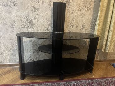 Qara rəngli TV stendi / media konsolu - Material: parlaq qara şüşə panellər və möhkəm sütun formalı dayaqlar - Dizayn: ön hissəsi qabarıq (yarımoval) formadadır, yumru künclər; üstündə TV və ya ak...