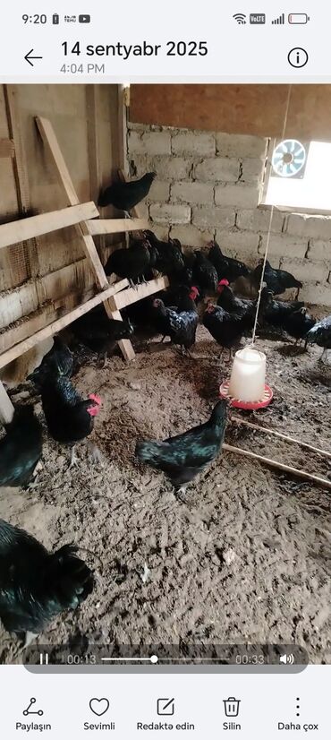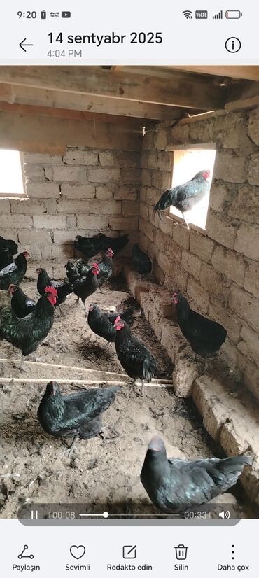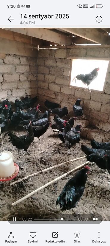 - Şəkillərdə qapalı tövlədə saxlanılan, qara lələkləri və qırmızı daraqları olan sağlam toyuq‑xoruz sürüsü görünür.