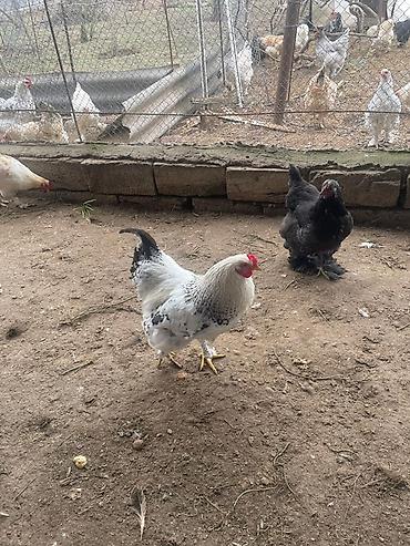 Brahma cinsi ev quşları – toyuq və xoruzlar - Cins: Brahma (iri gövdə, tüklü pəncələr, sakit xasiyyət) - Rəng: Ağ əsaslı, boyun və quyruqda qara naxışlar; tam ağ xoruzlar da var - Təyinat: Yumurta...