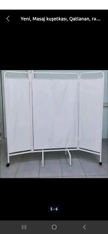 Şəkillərdə əlavə olaraq uyğun aksesuar və avadanlıqlar görünür: təkərli ustə taburetləri, şüşə rəfli servis arabaları və 3-panelli mobil pərdə (ekran) – məkan bölmək və məxfiliyi təmin etmək üçün.