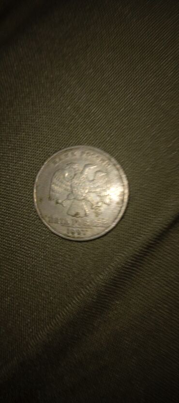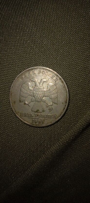 - Rusiya Federasiyası sikkəsi: “Банк России” yazısı və iki başlı qartal təsviri; nominal: “Пять рублей”; tarix: 1997 (KM işarəsi görünür).