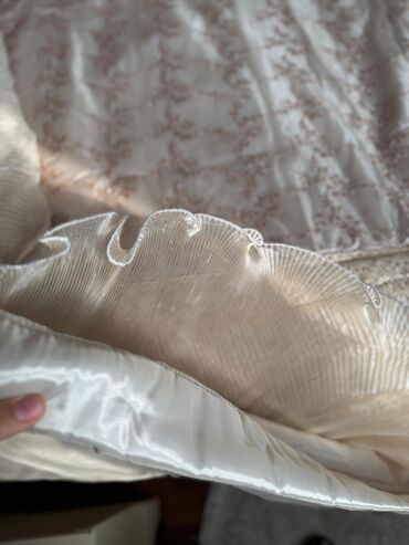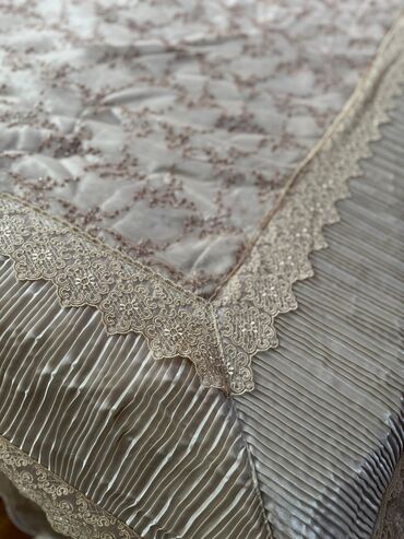 - Materiallar: atlas parça, plisəli saten haşiyələr, üst hissədə incə tül və muncuqvari aplikasiyalı naxış; kənarlarda zərif qızılı krujeva