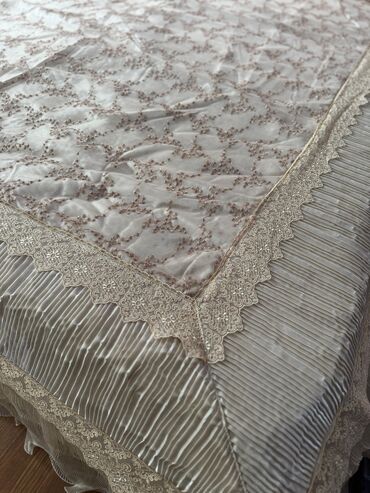 - Dizayn: üçbucaq birləşməli künclər, geniş plisəli bordür, klassik ornamentli krujeva işləmələr; zərif parıltılı tekstura