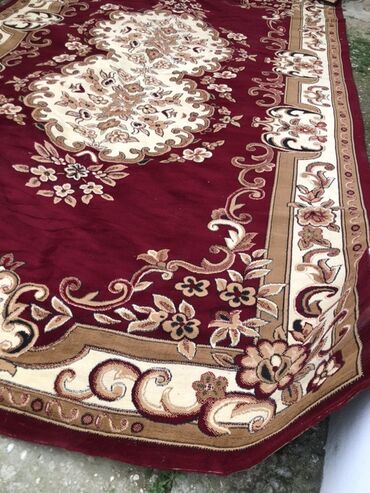 Xalça – klassik Şərq üslubunda - Rənglər: əsas sahə tünd qırmızı/bordo, krem və bej tonlarında mərkəzi medalyon, qara, mavi və qızılı çalarlarla zəngin naxışlar - Dizayn: mərkəzi medalyon, çoxqat ...