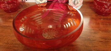 Qırmızı şüşə meyvə/servis qabı - Material: qalın şüşə - Rəng: dərin qırmızı (rubin ton) - Dekor: şüşə üzərində oyma bitki naxışları və dibində günəş şüası effektli işləmə - Forma: dairəvi, aşağı p...
