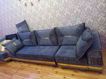 Mavi-qrafit rəng palitrasında, qızılı dekor elementləri ilə L formalı yumşaq künc divan.