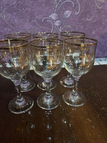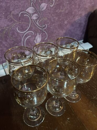 Qızılı naxışlı şərab qədəhləri dəsti - Miqdar: 6 ədəd - Material: şəffaf şüşə - Dizayn: qızılı haşiyə və qızılı floral ornamentlər - Forma: uzun gövdəli, nazik ayaqlı kiçik həcmli qədəhlər (likör/...