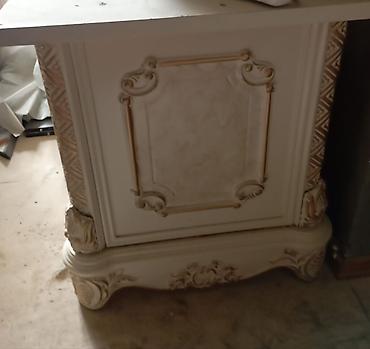 Dolab Ağ rəngdə, klassik elementlərlə bəzədilmiş yemək/çay masası. - Parlaq, hamar üst səth – təmizlənməsi asan. - Kənarlarda qızılı dekor lentləri, alt hissədə naxışlı ornament. - Stabil iki dayaq...