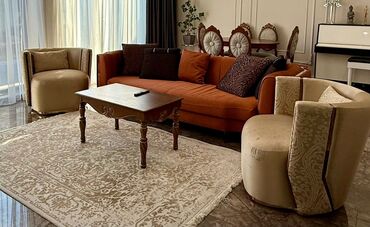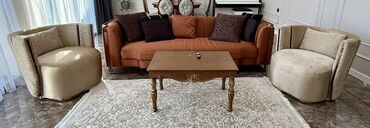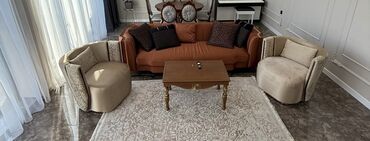 Zərif narıncı rəngdə üç nəfərlik divan və iki krem rəngli təkli kresloları satilir. Turkiye istehsali. Alfemodan alinib