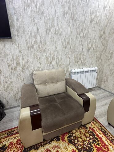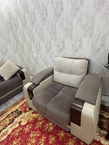 Qonaq otağı üçün yumşaq mebel dəsti - Tərkib: 1 ədəd geniş kreslo + 1 ədəd divan - Rəng: qəhvəyi-bej kombinasiyası - Material: yumşaq parçalı üzlük, toxunuşda xalça-kimi zərif, dekorativ zolaqlı a...