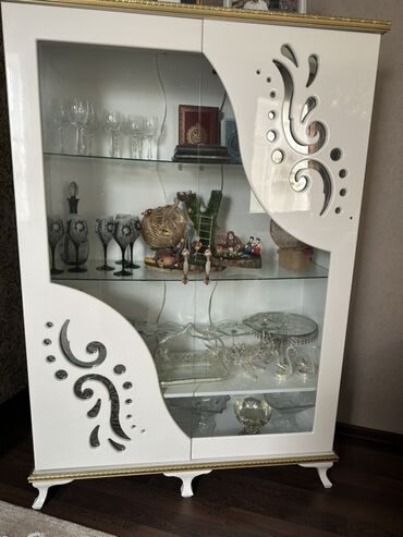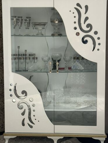 2) 2 ədəd vitrin şkafı: ön hissə şüşə qapılı, içəridə iki səviyyəli şüşə rəflər. Yan panellərdə naxışlı dekor, aşağıda klassik ayaqlar, yuxarı və aşağı hissədə qızılı haşiyə.