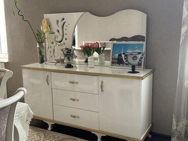 1) Geniş komod-güzgü: üstü parlaq, kənarları qızılı haşiyə. Ortada 3 çekmece, hər iki yanda qapalı dolab bölməsi. Arxada dalğalı formalı böyük güzgü paneli.