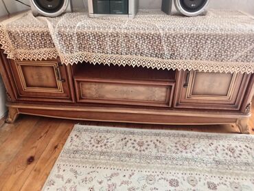 Türk sənətkarları tərəfindən zövqlə yığılmış Klassik üslubda vitrindən və TV altlığından ibarət qonaq otağı dəsti. - Material: təbii ağacdan və MDF şpondan hazırlanmış, qəhvəyi rəngli, relyefli de...