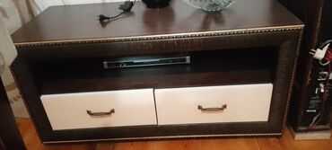 • TV tumbası: Üst platforma, açıq rəf (media qurğuları üçün) və ön hissədə 2 çekmece. Tünd qəhvəyi korpus, krem rəngli çəkmece önlükləri və bürünc tutacaqlar.
