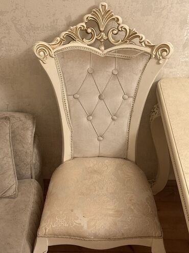 - 4 ədəd klassik stul (şəkillərdə görünən), arxalıqda oyma tac, düyməli kapitone