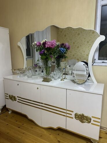 Klassik üslubda dekorativ güzgülü bufet/konsol dəsti. - Ön hissədə iri ölçülü güzgü paneli, tağvari dekor xətti və qızılı rəngdə ornamentlər - Aşağı hissə: 4 qapılı şkaf bölməsi; hamar krem rəngli...