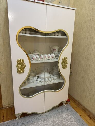 Klassik üslubda qonaq otağı mebel dəsti Dəst tərkibi: - 2 ədəd şüşə vitrin şkafı: ikitərəfli şüşə qapılar, içəridə şüşə rəflər, künclərdə dekorativ ağ naxışlar, metal tutacaqlar, çərçivədə zərif b...