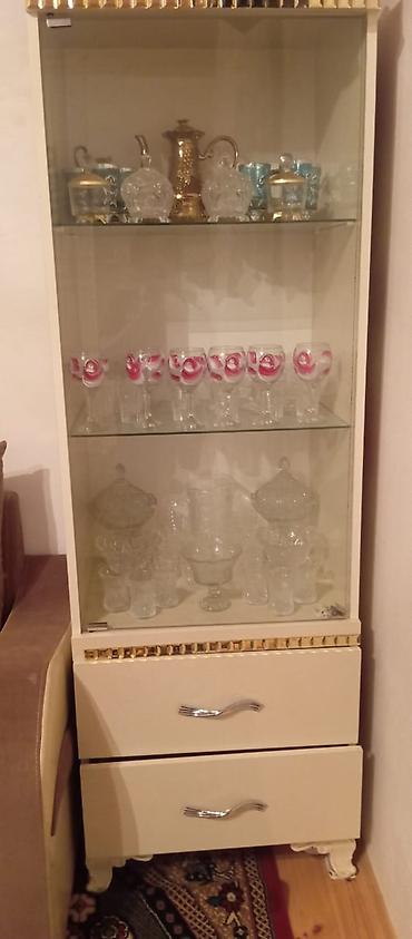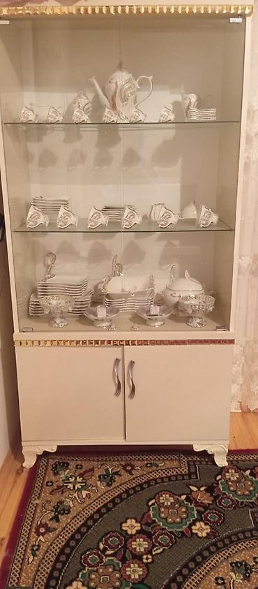 - 2 ədəd vitrin şkafı: şüşə qapılı, 3 şüşə rəfli, aşağı hissədə biri ikili qapı, digəri 2 iri siyirmə ilə. Üst kənarlarda qızılı dekor elementləri, ön tərəfdə metal tutacaqlar, oyma dayaq ayaqları.