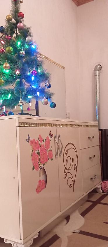 - Komod-güzgü: geniş üst səth, böyük güzgü paneli, sağ tərəfdə 3 siyirmə, sol tərəfdə iki qapılı bölmə. Ön fasadda gül və naxış dekoru, qızılı haşiyə, metal tutacaqlar.