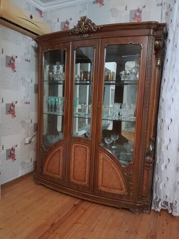 - Vitrin şkafı: 4 qapılı, ön hissəsi şüşəli; içəridə şüşə rəflər, işıq ötürən arxa panel sayəsində qab-qacaq və suvenir nümayişi üçün uyğundur