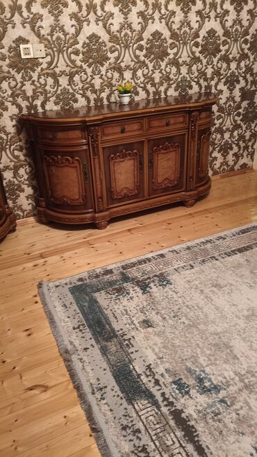 - 1 ədəd iri ölçülü konsol/TV tumbası: təbii ağac fakturalı, oyma dekorlu ön panellər, qövsvari yan hissələr. Üst hissə genişdir. Mərkəzdə 3 qapılı bölmə, yuxarıda 3 kiçik çekmece; yanlarda əlavə qapılar – serviz, tekstil və aksesuar saxlamaq üçün rahatdır.