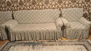 - Yumşaq mebel: 3 nəfərlik divan və 2 ədəd kreslo. Üzərində naxışlı elastik örtüklər var; açıq boz rəng, romb motivləri və ətək hissəsi pərdəli dizaynda. Rahat oturacaq və geniş qol dayaqları.