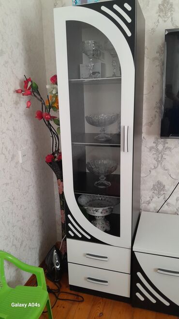 🔹 Vitrin şkafı — qara-ağ rəngdə dəbli dizayn, şüşə qapılar və geniş çekmecələr. Qab-qacaq, dekorativ əşyalar və aksesuarlar üçün uyğundur.