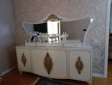Klassik üslubda qonaq otağı üçün mebel dəsti: - Konsol-bufet: krem rəngli, parlaq səth, ön hissədə dekorativ qızılı elementlər. Üst hissədə geniş saxlama üçün çekmece, aşağıda dörd qapılı bölmə. Ü...