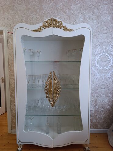 Qonaq otağı üçün klassik üslubda mebel dəsti. Tərkibi: - Şüşə vitrin şkaf (iri ölçülü, 2 mərkəzi və 2 yan şüşə qapılı, içəridə şüşə rəflər, güzgülü arxa panel). Dekorativ relyeflər, qızılı aksesua...