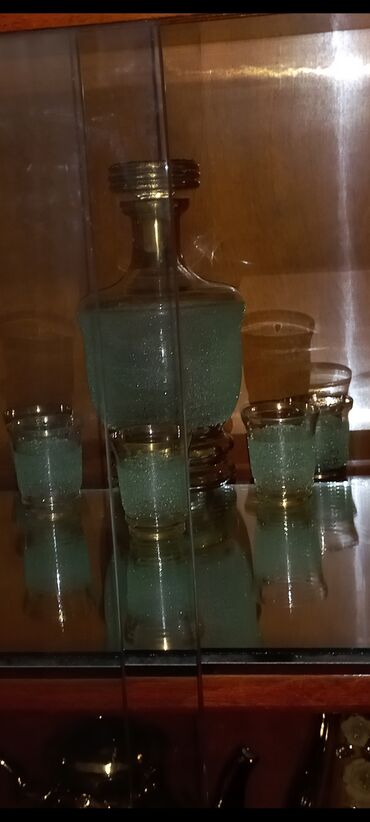 Ağ balıq formalı keramik qrafin və eyni üslubda hazırlanmış 6 ədəd kiçik qədəh 1100 manat.Qədəhlər tünd göy rəngdədir, balıq dizaynı ilə işlənmişdir. Qrafin və qədəhlər dekorativ məqsədlər üçün və ya içki servisi üçün istifadə oluna bilər.Sovet dövrünün istehsalı.Təzədir.Endirim olacaq.Şüşə qrafin və 5 ədəd stəkandan ibarət dəst 60 manat. Qrafin yuvarlaq formaya və tıxaca malikdir. Stəkanlar qrafinin dizaynını təkrarlayır. Dəst içkilərin servis edilməsi üçün nəzərdə tutulub.