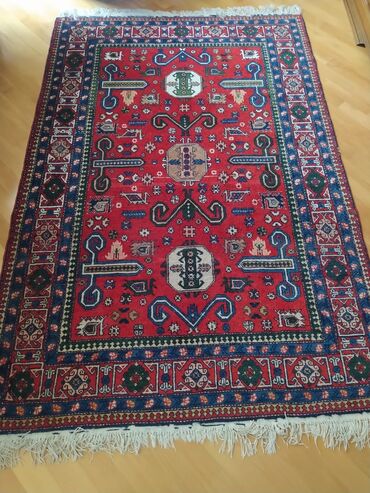 Xalça – əl toxuması üslubunda, qırmızı fonlu, üç böyük həndəsi medalyonlu dizayn. - Ölçü: təxmini 1,5 x 0,9 m (foto üzrə). - Rəng palitrası: tünd qırmızı əsas, mavi, tünd lacivərd, krem və yaşıl t...