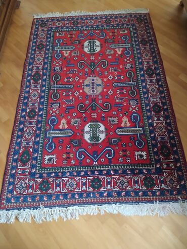 Əl toxuması milli naxışlı xalça - Stil: Azərbaycan xalçaçılıq ənənələrinə uyğun geometrik motivlər - Rəng palitrası: qırmızı əsas fon, mavi mərkəzi medalyonlar, yaşıl və qara romb motivləri, narın...