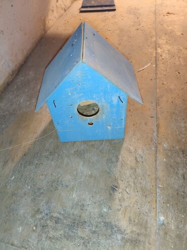 - Taxta quş evi: üçbucaq damlı, ön hissədə dairəvi giriş dəliyi və hava ventilyasiya üçün əlavə deşiklər. Bağça, balkon və ya həyət üçün uyğun, standart dirəyə və ya divara bərkidilə bilər. Rəngi mavi.