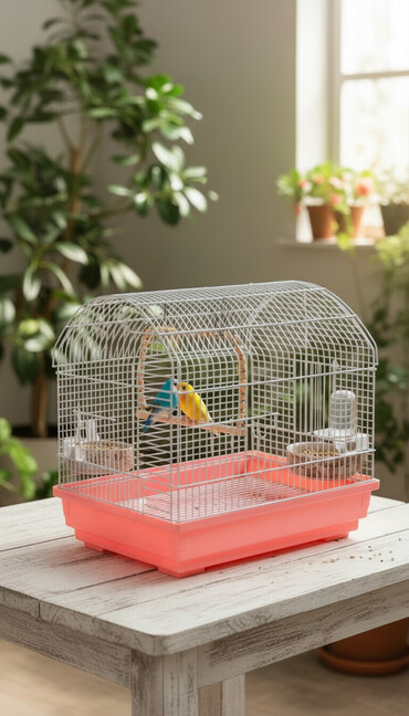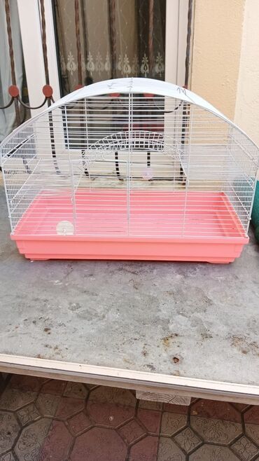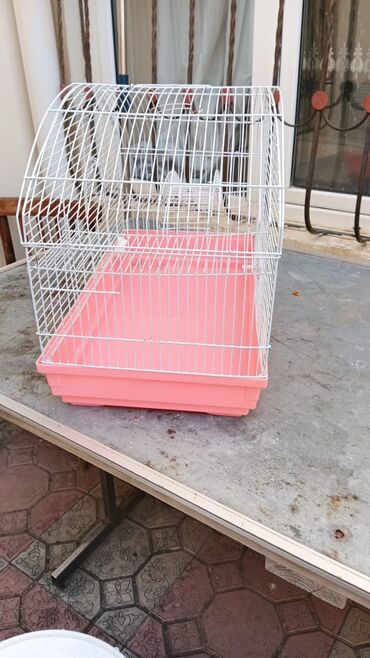 Quş qəfəsi – geniş ölçülü, ağ metal barmaqlıqlar və çəhrayı/plastik altlıq.